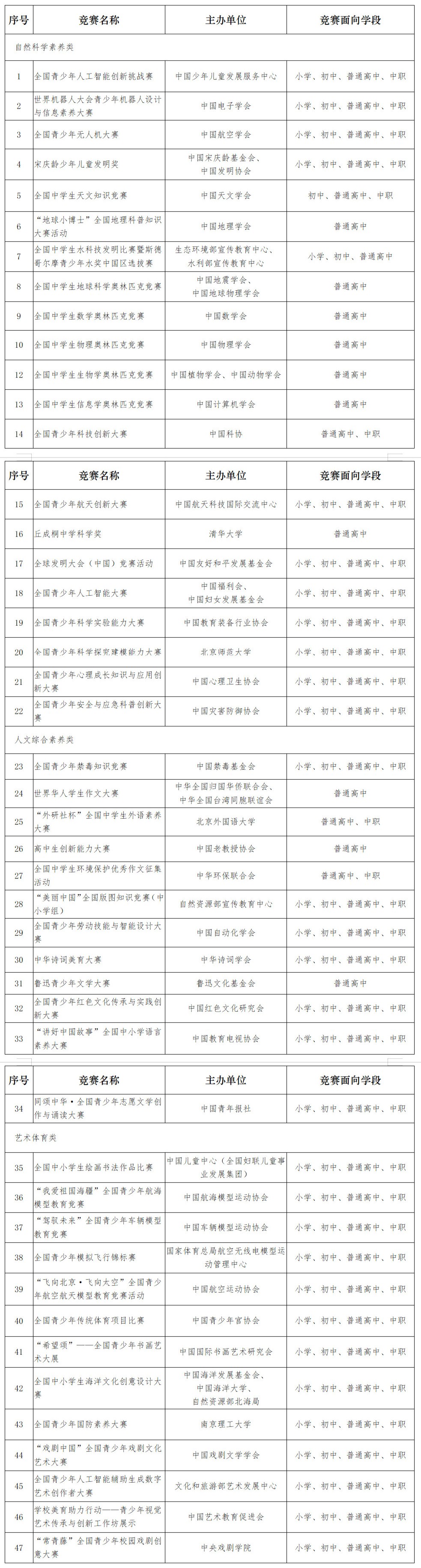 近日,教育部公布了2025-2028学年全国中小学生竞赛名单。 “全国青少年人工智能创新挑战赛”等共47项赛事入围。此次公布的名单是根据教育部、中组办、民政部、市场监管总局2022年印发的《全国中小学生竞赛管理办法》(以下简称《管理办法》)的要求。入围竞赛原则上举办时间为2025年10月至2028年8月,期间每学年举办次数不超过1次,累计不超过3次。比赛及比赛成绩不得作为中小学招生的依据竞赛成绩不得非法用于高考招生。为方便家长和学生查询、了解各项赛事信息,教育部将于近期在全国校外教育培训监管服务综合平台和“校外培训家长端”APP上线相关功能,同时公布各类赛事报名、成绩公告、成绩公布等重要开展信息。教育部要求各地按照《管理办法》,会同区管、民政、市场监管等事业单位进一步规范竞赛管理,加大竞赛管理政策和竞赛名单的宣传力度,引导榜单竞赛有序开展。不断提高竞赛质量,确保福利特色,充分发挥竞赛的教育功能。附件:2025-2028学年全国中小学生竞赛名单 来源:教育部网南方网、广东调研记者 陈蓉 上一篇:外媒防守放缓?中国花样滑冰运动员因展示导弹