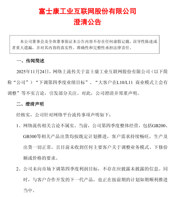 11月24日,网络上流传工业富联(601138.sh)“下调四季度业绩目标”、“重点客户调整L10/L11业务模式”等言论。相关传言导致工业富联盘中跌停。截至11月24日收盘,工业富联实业(601138.sh)跌7.80%至55.94元/股。当日晚间,工业富联(601138.sh)发布公告称,网络流传的相关言论不实。目前,公司第四季度整体运营情况,包括GB200、GB300及其他相关产品的出货量均按既定计划进展。客户需求持续旺盛,生产和出货正常,未收到主要客户调整业务模式、减少份额或降价的要求。公告还称,公司并未向市场下调第四季度营收目标,也没有未披露的情况。需要披露的信息。与此同时,与客户合作开发的下一代产品正在按计划顺利推进。南方网广东考察记者 卢少聪 上一篇:第四届广东省“南粤家政”职业技能大赛决赛在
