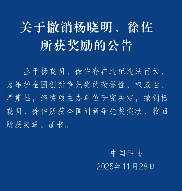 - 2025/11/29中国科协:杨晓明、徐佐违纪违法及获奖
