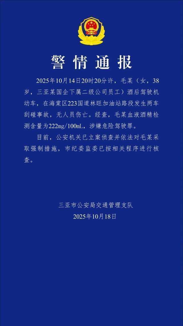 近日,海南三亚一醉酒女子倒车劳斯莱斯后威胁:“我是国企人,让市委、市政府通知我。”今日(10月18日),三亚市公安局交管支队发布警情通报称,10月14日,毛某(女,38岁,三亚市某国营二公司员工)闯入某汽油燃料路段、该区某小区。没有人员伤亡。经查,毛某血液酒精含量为222mg/100ml,涉嫌危险驾驶。目前,公安机关已立案侦查,并依法对毛采取强制措施。市纪委按照相关程序进行核查。相关视频截图。南方网、广东学习研究搬运工卢少聪 上一篇:“胖子并不缺乏活力”!奥运会射击冠军刘玉坤